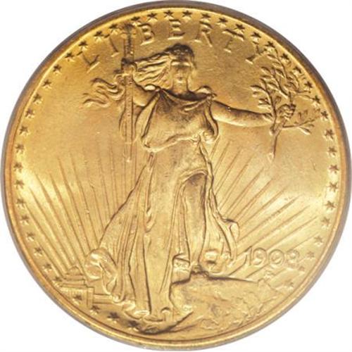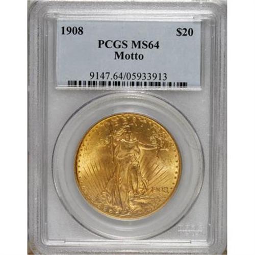 <B>1908 $20 Motto MS64 PCGS.</B></I> Unlike its No Motto counterpart (4,271,551 coins produced), the 1908 Motto double eagle is a scarce issue from a low mintage (156,258 pieces). This attractive near-Gem is lustrous and attentively struck, with uniformly bold details on each side. A few minor marks and luster grazes prevent a higher grade, but the coin retains a substantial degree of overall eye appeal. <BR><BR><b>Shipping:</b> Coins & Currency (<a target="_blank" href="http://www.heritageauctions.com/common/shipping.php">view shipping information</a>)