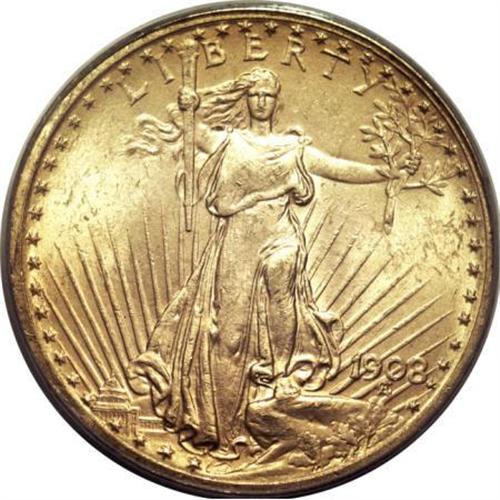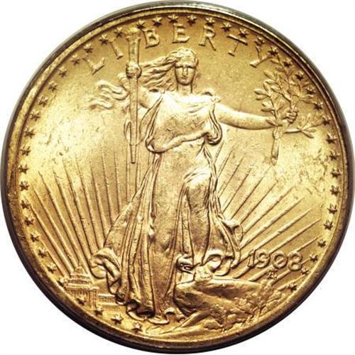 <B>1908 $20 Motto MS64 PCGS.</B></I> A completely original survivor of the 1908 With Motto Saint-Gaudens double eagle issue. Stunning luster shimmers atop attractive surfaces on this well struck, apricot-gold example. PCGS has graded a mere 51 coins higher than the current piece, and the number at NGC is only 25 (3/08).<BR><BR><B>Coin Engraver:</B> Augustus Saint-Gaudens<BR><BR><b>Shipping:</b> Coins & Currency (<a target="_blank" href="http://www.heritageauctions.com/common/shipping.php">view shipping information</a>)