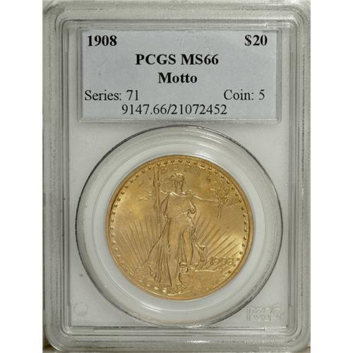 <B>1908 $20 Motto MS66 PCGS.</B></I> Omitting the customary motto IN GOD WE TRUST was not a trivial matter for President Roosevelt. As early as April 1907, he asked Director Roberts for an opinion. According to Roger Burdette's research in the archives: "Roberts replied that it was not required by law, but that the Solicitor of the Treasury said that the motto had been in use for so long that that Congress may have lost the ability to prevent its use." Roosevelt decided to omit the motto on the new gold coin designs and all double eagles and eagles issued in 1907 lacked the motto. This simplified the designs and improved the overall artistic effect.<BR> When the first coins were released in early November 1907, the omission was noticed immediately. Within a few days, letters, telegrams, and petitions peppered the President, Congress, Treasury and the Mint Bureau. Roosevelt issued a lengthy statement explaining his view that, " ... to put such a motto on coins ... does positive harm ... and is in effect irreverence which comes dangerously close to sacrilege ... A beautiful and solemn sentence such as the one in question should be treated and uttered only with that fine reverence which necessarily implies a certain exaltation of spirit." But public sentiment and the Congress were too much behind adding the motto, and by February 20, 1908, the mint had struck a pattern double eagle with the motto on the reverse for Roosevelt to approve. Legislation requiring the motto easily passed Congress and was signed on May 17. By May 23, the mint had made new patterns of both ten and twenty dollar coins for final approval. After June 17, 1908, all the new design gold coins carried the required inscription.<BR> This is a strongly struck example that has rich mint frost and an overlay of beautiful, subtle rose and lilac patina. An outstanding, high grade With Motto twenty and a scarce opportunity to acquire this issue in the ultimate grade. Only 10 other pieces have been so graded by PCGS, and seven others by NGC, with none finer at either service (10/06). It is also interesting to note that Heritage has only offered an MS66 example once before, at the sale of the Phillip H. Morse Collection in November 2005.<BR><I>From The Kutasi Collection.</B></I><BR><BR><b>Shipping:</b> Coin/Currency (<a target="_blank" href="http://www.heritageauctions.com/common/shipping.php">view shipping information</a>)