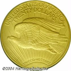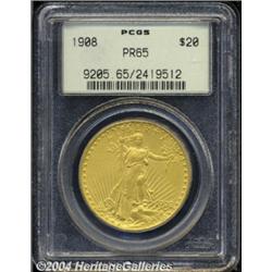 <B>1908<$20> Motto PR65 PCGS.</B></I> The Philadelphia Mint produced both No Motto and Motto business strike Double Eagles in 1908. The proofs, however, were struck later in the year as they are all of the Motto type, a result of Congressional support of the mention of the deity on the nation's larger coins. Breen (1977) states that these coins were produced with three different finishes: light matte, dark matte, and "Roman Gold." While it would be a gross misnomer to label the 1908 proof Twenty a common coin, it is true that it is the date most frequently encountered among the eight issues in this very rare series. Green (1936) notes that an unknown number of proofs were melted in the mint as unsold on January 2, 1909. Published estimates of the number of survivors of this issue range from as few as 15 to 25 (Bowers) to as many as 30 to 35 (Akers). We believe the number to be even larger and estimate that there are between 45 and 60 pieces in all grades known today.<BR> An original coin, both sides display the olive-gold color that is characteristic of many extant dark matte examples. The surfaces exhibit a slightly granular texture, and the only mentionable abrasion one can use as a future identifier is seen in the obverse field to the left of the base of the torch. This is only detected, however, as the coin is turned under a light source. The crisp striking details are indicative of proof production methods. An important rarity from a perennially popular 20th century gold series. Population: 14 in 65, 1 finer (3/04). <BR><BR><B>Important notice:</B> Heritage usually auctions material at the rate of 200-250 lots per hour. On some occasions eBay Live bid software or the Internet may not be able to keep up with the pace of the auction. We recommend placing a realistic absentee bid now as insurance to avoid disappointment. Occasionally the auctioneer may eliminate or reject an eBay Live bid, and the auctioneer may also reopen a lot after the close of the eBay live bidding (usually because we missed an audience bid), and may reject your bid even if it shows you as the winning bidder. By bidding via eBay Live, you agree that Heritage may award the lot to another bidder at its sole discretion under the circumstances described above or any other reasonable circumstances. Since eBay bids are not shown to us until we open the lot on the floor, we treat those bids just like floor bids. In most cases the floor responds before the eBay bid is presented to us, due to Internet lag time, so for consistency we have made it a policy that floor bids are always considered first over tie eBay live bids. Also please note that all Heritage lots purchased through eBay Live carry a 20% Buyer's Premium. Please make sure you read the Terms and Conditions before you bid. </span></font></tr></table></td></tr></table>