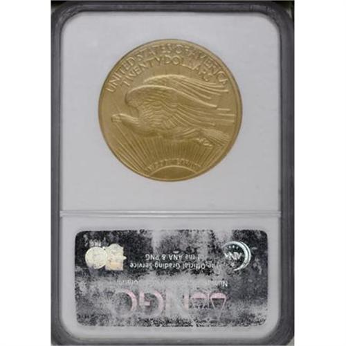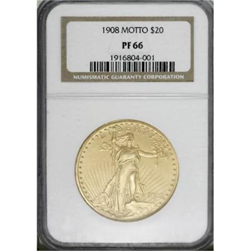 <B>1908 $20 Motto PR66 NGC.</B></I> The artistic spirit that was unleashed at the U.S. Mint with the new Saint-Gaudens designs apparently carried over to the Mint's experiments with proof gold finishes in the 1900s and 1910s, before regular-issue proof gold coinage largely came to an end in 1915. The 1908 With Motto proof double eagles were the first proofs sold to the public of the new Saint-Gaudens design. While the Mint tried as many as three different finishes on proof gold in 1908, the large majority were produced in a dark, fairly coarse-grained matte proof finish. Matte proofs were all the rage at European mints of the era, particularly Paris, but they failed to catch on with American collectors, who preferred brighter, more reflective finishes of earlier years. Proof gold of 1909 and 1910 saw the lighter Roman or Satin Finish. <BR> The matte finish on this impressive piece is not quite as coarse as on some examples from this year, nor does it give off as much of a sparkling appearance. The mustard-gold surfaces display sharply struck design elements, with no areas of weakness. No significant contact marks or copper spots are apparent on either side. Close inspection of the obverse rims exhibits incompleteness, or a somewhat "wavy" effect, from about 7 o'clock to 1 o'clock. We cannot provide a definitive explanation for this, but it may be associated with David Bowers' observation in his 2004 <I>A Guide Book of Double Eagle Gold Coins</B></I> that "Some (1908) Proofs have a slight 'ripple effect' on the rim due to lack of metal to permit the raised rim and raised edge letters to be fully brought up at the same time." Census: 26 in 66, 11 finer (11/07).<BR><BR><B>Coin Engraver:</B> Augustus Saint-Gaudens<BR><BR><b>Shipping:</b> Coins & Currency (<a target="_blank" href="http://www.heritageauctions.com/common/shipping.php">view shipping information</a>)