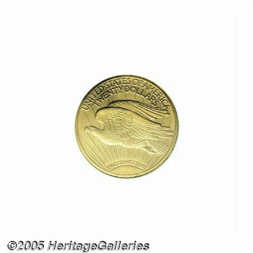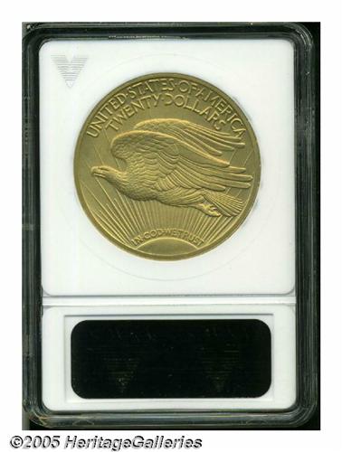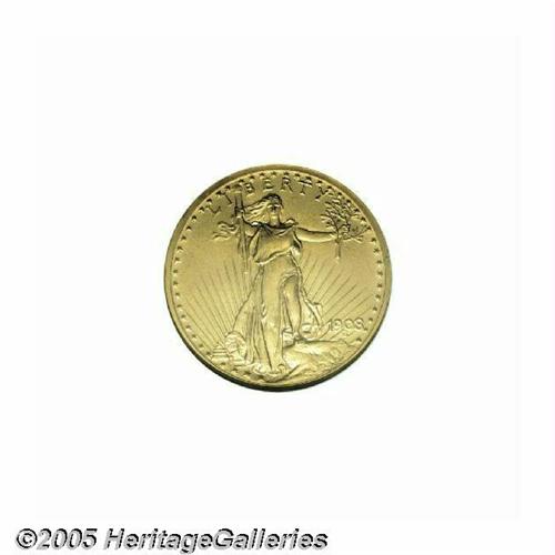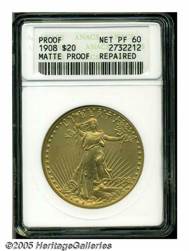 <B>1908<$20> Motto--Repaired--ANACS. Proof, Net PR60.</B></I> First year of issue for the matte proof series, only 101 proofs were struck. While technically correct, the disclaimer about a repair could lead the collector to a false conclusion. The surfaces overall are exceptionally attractive with a pleasing, undisturbed matte finish--except in one area. On the sun on the lower reverse, there is a contact mark that someone tried to smooth over. In the process of doing so, the matte surface was interrupted. But this is a small area and the remainder of the proof surface is pristine and unaffected by marks or shiny spots.