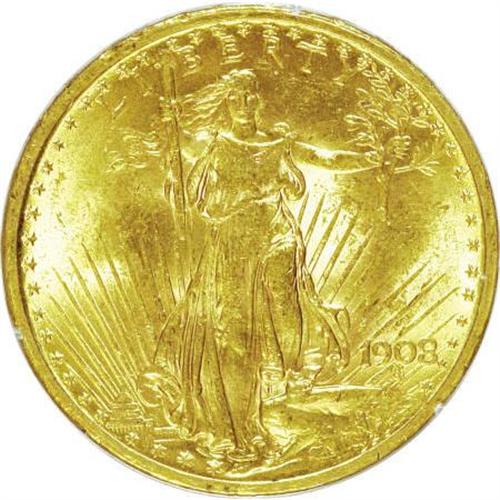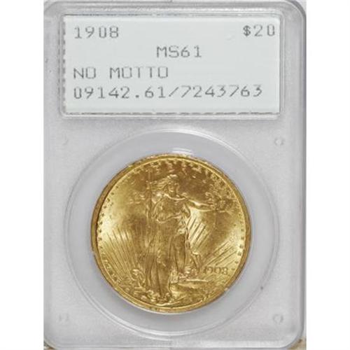<B>1908 $20 No Motto MS61 PCGS.</B></I> . PCGS Population (2746/83585). NGC Census: (3576/100277). Mintage: 4,271,551. Numismedia Wsl. Price for NGC/PCGS coin in MS61: $960. (#9142)<BR><BR><B>Coin Engraver:</B> Augustus Saint-Gaudens<BR><BR><b>Shipping:</b> Coins & Currency (<a target="_blank" href="http://www.heritageauctions.com/common/shipping.php">view shipping information</a>)