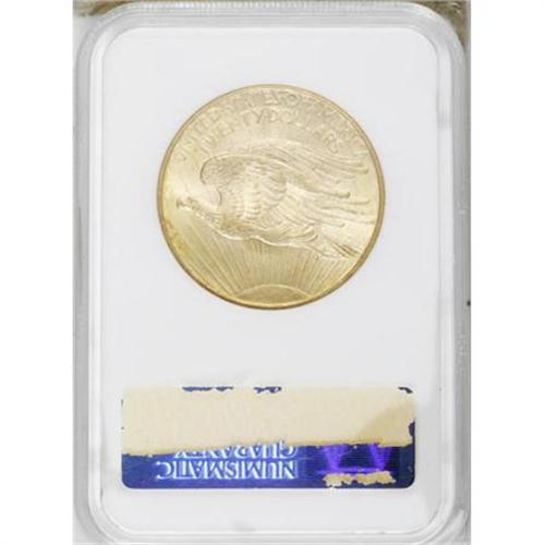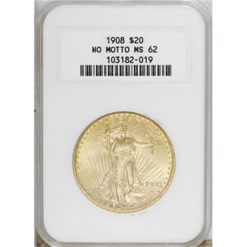 <B>1908 $20 No Motto MS62 NGC.</B></I> NGC Census: (21093/77971). PCGS Population (15711/66596). Mintage: 4,271,551. Numismedia Wsl. Price for NGC/PCGS coin in MS62: $758. (#9142)<BR><BR><B>Coin Engraver:</B> Augustus Saint-Gaudens<BR><BR><b>Shipping:</b> Coins & Currency (<a target="_blank" href="http://www.heritageauctions.com/common/shipping.php">view shipping information</a>)