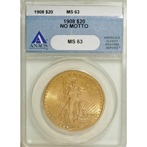 <B>1908 $20 No Motto MS63 ANACS.</B></I> NGC Census: (37759/40145). PCGS Population (26911/39596). Mintage: 4,271,551. Numismedia Wsl. Price for NGC/PCGS coin in MS63: $790. (#9142)<BR><BR><B>Coin Engraver:</B> Augustus Saint-Gaudens<BR><BR><b>Shipping:</b> Coins & Currency (<a target="_blank" href="http://www.heritageauctions.com/common/shipping.php">view shipping information</a>)