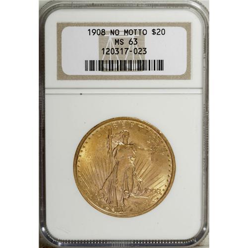 1908 $20 No Motto MS63 NGC. NGC Census: (36726/445