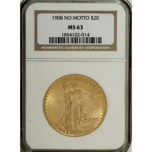 <B>1908 $20 No Motto MS63 NGC.</B></I> NGC Census: (36839/44841). PCGS Population (26128/35218). Mintage: 4,271,551. Numismedia Wsl. Price for NGC/PCGS coin in MS63: $775. (#9142)<BR><BR><b>Shipping:</b> Coins & Currency (<a target="_blank" href="http://www.heritageauctions.com/common/shipping.php">view shipping information</a>)