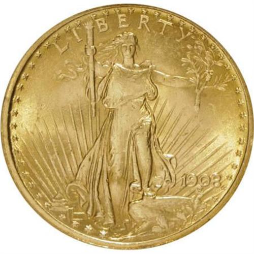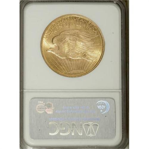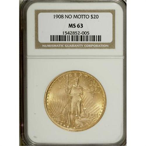 <B>1908 $20 No Motto MS63 NGC.</B></I> NGC Census: (37265/39648). PCGS Population (26448/37596). Mintage: 4,271,551. Numismedia Wsl. Price for NGC/PCGS coin in MS63: $795. (#9142)<BR><BR><B>Coin Engraver:</B> Augustus Saint-Gaudens<BR><BR><b>Shipping:</b> Coins & Currency (<a target="_blank" href="http://www.heritageauctions.com/common/shipping.php">view shipping information</a>)