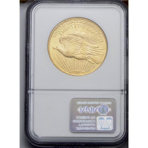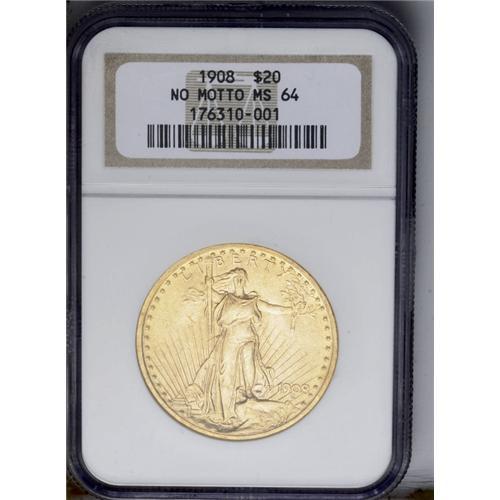<B>1908<$20> No Motto MS64 NGC.</B></I> A pleasing example with lustrous medium yellow-gold surfaces and excellent eye appeal. A few minor marks on each side limit the grade of this near-Gem double eagle.