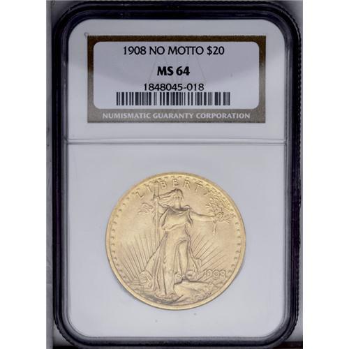 1908 $20 No Motto MS64 NGC. An especially lustrous exa 1908[$20] No Motto MS64 NGC.