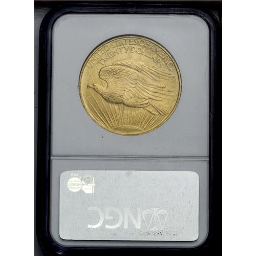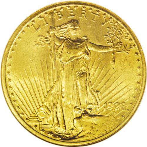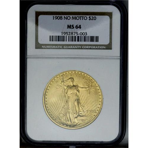 <B>1908<$20> No Motto MS64 NGC.</B></I> An orange-gold piece with quite clean fields for the grade. A sharply struck example with satiny luster, perfect for a type set.