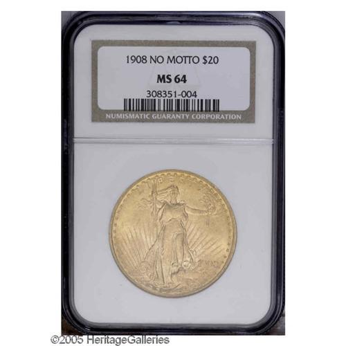 1908 $20 No Motto MS64 NGC. Bright, uncommonly lustrou 1908[$20] No Motto MS64 NGC.