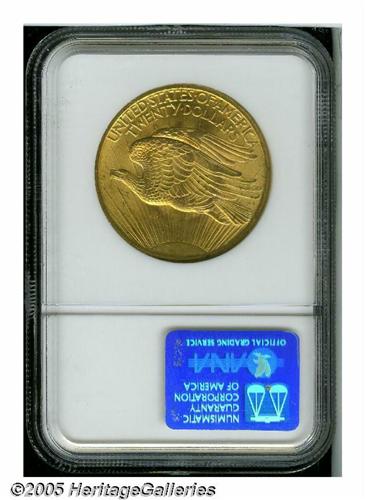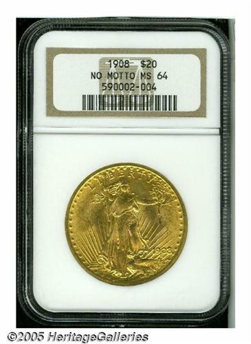 <B>1908<$20> No Motto MS64 NGC.</B></I> Lavish pink and green-gold toning adorns the bright, matte-like surfaces that reveal crisply struck design features and just a few small, scattered contact marks that limit the grade. Still a pleasing near-Gem example.