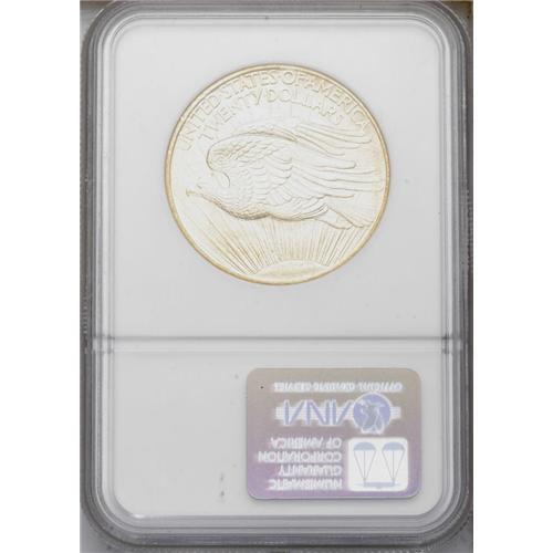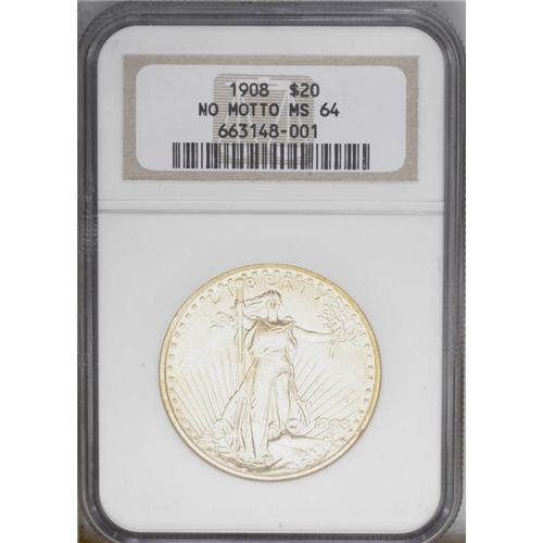 <B>1908<$20> No Motto MS64 NGC.</B></I> Long Rays subtype. This lustrous and nicely impressed honey-gold type coin has clean fields, and the devices are also largely unabraded. An obverse rim mark is noted at 4:30. <BR><BR><B>Important notice:</B> Heritage usually auctions material at the rate of 200-250 lots per hour. On some occasions eBay Live bid software or the Internet may not be able to keep up with the pace of the auction. We recommend placing a realistic absentee bid now as insurance to avoid disappointment. Occasionally the auctioneer may eliminate or reject an eBay Live bid, and the auctioneer may also reopen a lot after the close of the eBay live bidding (usually because we missed an audience bid), and may reject your bid even if it shows you as the winning bidder. By bidding via eBay Live, you agree that Heritage may award the lot to another bidder at its sole discretion under the circumstances described above or any other reasonable circumstances. Since eBay bids are not shown to us until we open the lot on the floor, we treat those bids just like floor bids. In most cases the floor responds before the eBay bid is presented to us, due to Internet lag time, so for consistency we have made it a policy that floor bids are always considered first over tie eBay live bids. Also please note that all Heritage lots purchased through eBay Live carry a 20% Buyer's Premium. Please make sure you read the Terms and Conditions before you bid. This lot is being auctioned in conjunction with a live floor auction by Heritage Galleries & Auctioneers. All final auction and invoice information will be supplied by Heritage Galleries & Auctioneers, and all other information should be considered preliminary. Lot:4524 <BR><BR><B>Winning Notification and Billing:</B> After the FINAL session in this auction is complete, Heritage will send e-mail and snail mail invoices. This process normally takes several days. All final auction and invoice information will be supplied by Heritage Galleries & Auctioneers, and all other information should be considered preliminary. <BR><BR>This auction will be conducted on a live auction floor and over the Internet through eBay Live. If you choose to place an absentee bid, please take a moment to <font color='#0000ff'><u><a href='http://pages.ebay.com/liveauctions/help/before/laabsentee.html'>learn how eBay Live absentee bidding works</a></u></font><font color='#000000'>