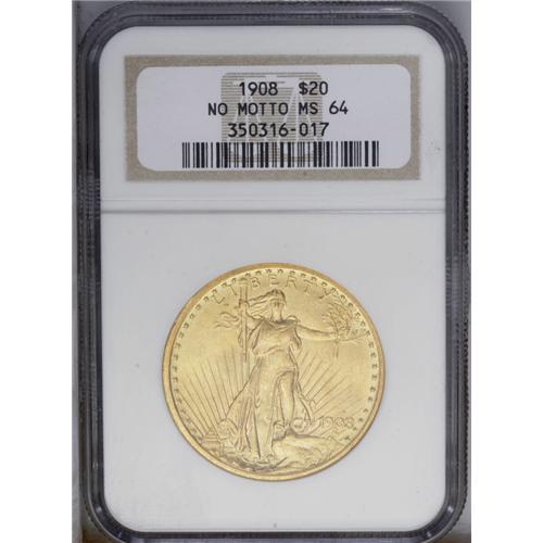 <B>1908<$20> No Motto MS64 NGC.</B></I> Long Rays hub. A lustrous canary-gold type coin whose clean surfaces ensure exceptional eye appeal for the given grade. <BR><BR><B>Important notice:</B> Heritage usually auctions material at the rate of 200-250 lots per hour. On some occasions eBay Live bid software or the Internet may not be able to keep up with the pace of the auction. We recommend placing a realistic absentee bid now as insurance to avoid disappointment. Occasionally the auctioneer may eliminate or reject an eBay Live bid, and the auctioneer may also reopen a lot after the close of the eBay live bidding (usually because we missed an audience bid), and may reject your bid even if it shows you as the winning bidder. By bidding via eBay Live, you agree that Heritage may award the lot to another bidder at its sole discretion under the circumstances described above or any other reasonable circumstances. Since eBay bids are not shown to us until we open the lot on the floor, we treat those bids just like floor bids. In most cases the floor responds before the eBay bid is presented to us, due to Internet lag time, so for consistency we have made it a policy that floor bids are always considered first over tie eBay live bids. Also please note that all Heritage lots purchased through eBay Live carry a 20% Buyer's Premium. Please make sure you read the Terms and Conditions before you bid. This lot is being auctioned in conjunction with a live floor auction by Heritage Galleries & Auctioneers. All final auction and invoice information will be supplied by Heritage Galleries & Auctioneers, and all other information should be considered preliminary. Lot:4525 <BR><BR><B>Winning Notification and Billing:</B> After the FINAL session in this auction is complete, Heritage will send e-mail and snail mail invoices. This process normally takes several days. All final auction and invoice information will be supplied by Heritage Galleries & Auctioneers, and all other information should be considered preliminary. <BR><BR>This auction will be conducted on a live auction floor and over the Internet through eBay Live. If you choose to place an absentee bid, please take a moment to <font color='#0000ff'><u><a href='http://pages.ebay.com/liveauctions/help/before/laabsentee.html'>learn how eBay Live absentee bidding works</a></u></font><font color='#000000'>