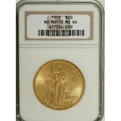 <B>1908 $20 No Motto MS64 NGC.</B></I> NGC Census: (27659/17384). PCGS Population (22560/13003). Mintage: 4,271,551. Numismedia Wsl. Price for NGC/PCGS coin in MS64: $890. (#9142)<BR><BR><b>Shipping:</b> Coins & Currency (<a target="_blank" href="http://www.heritageauctions.com/common/shipping.php">view shipping information</a>)
