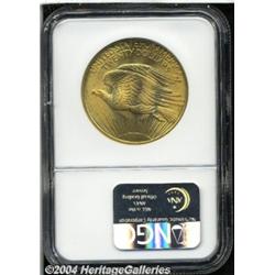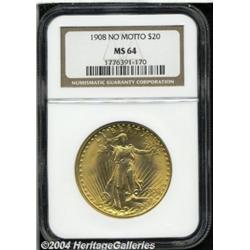 <B>1908<$20> No Motto MS64 NGC.</B></I> Well struck with amazingly smooth, glowing luster, even medium orange-gold color, and a minimal number of surface blemishes, for a near-Gem. Carefully preserved, with abundant visual appeal. <BR><I>From The Sarasota Collection.</B></I> <BR><BR><B>Important notice:</B> Heritage usually auctions material at the rate of 200-250 lots per hour. On some occasions eBay Live bid software or the Internet may not be able to keep up with the pace of the auction. We recommend placing a realistic absentee bid now as insurance to avoid disappointment. Occasionally the auctioneer may eliminate or reject an eBay Live bid, and the auctioneer may also reopen a lot after the close of the eBay live bidding (usually because we missed an audience bid), and may reject your bid even if it shows you as the winning bidder. By bidding via eBay Live, you agree that Heritage may award the lot to another bidder at its sole discretion under the circumstances described above or any other reasonable circumstances. Since eBay bids are not shown to us until we open the lot on the floor, we treat those bids just like floor bids. In most cases the floor responds before the eBay bid is presented to us, due to Internet lag time, so for consistency we have made it a policy that floor bids are always considered first over tie eBay live bids. Also please note that all Heritage lots purchased through eBay Live carry a 20% Buyer's Premium. Please make sure you read the Terms and Conditions before you bid. </span></font></tr></table></td></tr></table>