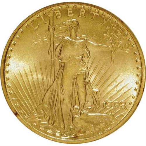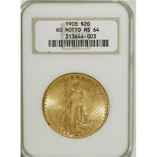 <B>1908 $20 No Motto MS64 NGC.</B></I> NGC Census: (27756/11892). PCGS Population (23642/14182). Mintage: 4,271,551. Numismedia Wsl. Price for NGC/PCGS coin in MS64: $840. (#9142)<BR><BR><B>Coin Engraver:</B> Augustus Saint-Gaudens<BR><BR><b>Shipping:</b> Coins & Currency (<a target="_blank" href="http://www.heritageauctions.com/common/shipping.php">view shipping information</a>)