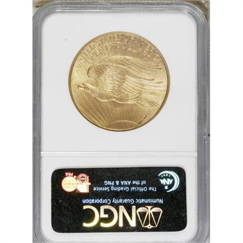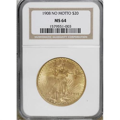 <B>1908 $20 No Motto MS64 NGC.</B></I> . NGC Census: (28429/12243). PCGS Population (25188/15422). Mintage: 4,271,551. Numismedia Wsl. Price for NGC/PCGS coin in MS64: $1,140. (#9142)<BR><BR><B>Coin Engraver:</B> Augustus Saint-Gaudens<BR><BR><b>Shipping:</b> Coins & Currency (<a target="_blank" href="http://www.heritageauctions.com/common/shipping.php">view shipping information</a>)
