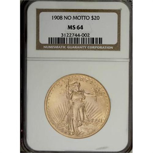 <B>1908 $20 No Motto MS64 NGC.</B></I> . NGC Census: (28442/12253). PCGS Population (25349/15614). Mintage: 4,271,551. Numismedia Wsl. Price for NGC/PCGS coin in MS64: $1,140. (#9142)<BR><BR><B>Coin Engraver:</B> Augustus Saint-Gaudens<BR><BR><b>Shipping:</b> Coins & Currency (<a target="_blank" href="http://www.heritageauctions.com/common/shipping.php">view shipping information</a>)