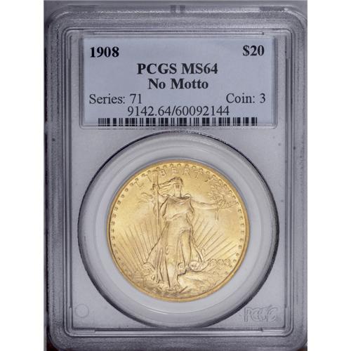 1908 $20 No Motto MS64 PCGS. This is a sharp-looking n 1908[$20] No Motto MS64 PCGS.