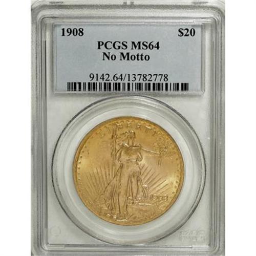 <B>1908 $20 No Motto MS64 PCGS.</B></I> PCGS Population (23771/14204). NGC Census: (27844/11930). Mintage: 4,271,551. Numismedia Wsl. Price for NGC/PCGS coin in MS64: $845. (#9142)<BR><BR><B>Coin Engraver:</B> Augustus Saint-Gaudens<BR><BR><b>Shipping:</b> Coins & Currency (<a target="_blank" href="http://www.heritageauctions.com/common/shipping.php">view shipping information</a>)