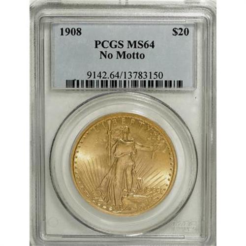 <B>1908 $20 No Motto MS64 PCGS.</B></I> PCGS Population (23771/14204). NGC Census: (27844/11930). Mintage: 4,271,551. Numismedia Wsl. Price for NGC/PCGS coin in MS64: $845. (#9142)<BR><BR><B>Coin Engraver:</B> Augustus Saint-Gaudens<BR><BR><b>Shipping:</b> Coins & Currency (<a target="_blank" href="http://www.heritageauctions.com/common/shipping.php">view shipping information</a>)