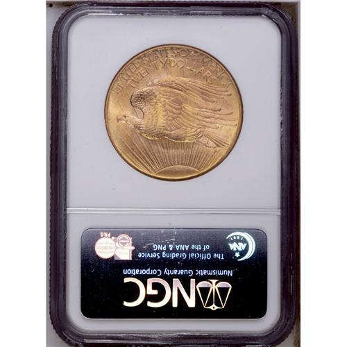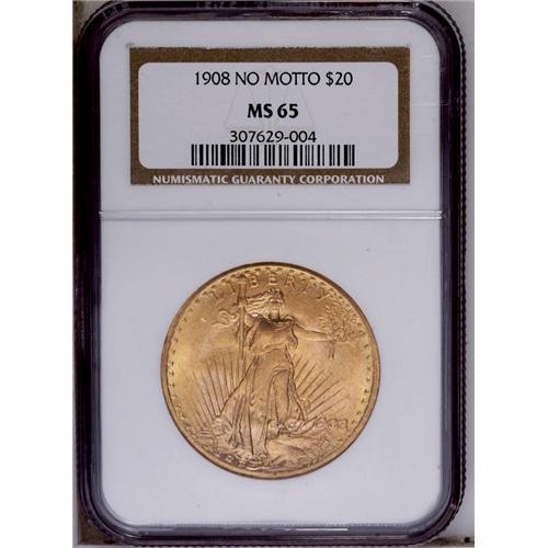 <B>1908<$20> No Motto MS65 NGC.</B></I> A highly attractive Gem, with full luster and luscious dark-orange and peach-red toning. Typically struck with a few minor marks on each side. <BR><BR><B>Important notice:</B> Heritage usually auctions material at the rate of 200-250 lots per hour. On some occasions eBay Live bid software or the Internet may not be able to keep up with the pace of the auction. We recommend placing a realistic absentee bid now as insurance to avoid disappointment. Occasionally the auctioneer may eliminate or reject an eBay Live bid, and the auctioneer may also reopen a lot after the close of the eBay live bidding (usually because we missed an audience bid), and may reject your bid even if it shows you as the winning bidder. By bidding via eBay Live, you agree that Heritage may award the lot to another bidder at its sole discretion under the circumstances described above or any other reasonable circumstances. Since eBay bids are not shown to us until we open the lot on the floor, we treat those bids just like floor bids. In most cases the floor responds before the eBay bid is presented to us, due to Internet lag time, so for consistency we have made it a policy that floor bids are always considered first over tie eBay live bids. Also please note that all Heritage lots purchased through eBay Live carry a 20% Buyer's Premium. Please make sure you read the Terms and Conditions before you bid. This lot is being auctioned in conjunction with a live floor auction by Heritage Galleries & Auctioneers. All final auction and invoice information will be supplied by Heritage Galleries & Auctioneers, and all other information should be considered preliminary. Lot:4542 <BR><BR><B>Winning Notification and Billing:</B> After the FINAL session in this auction is complete, Heritage will send e-mail and snail mail invoices. This process normally takes several days. All final auction and invoice information will be supplied by Heritage Galleries & Auctioneers, and all other information should be considered preliminary. <BR><BR>This auction will be conducted on a live auction floor and over the Internet through eBay Live. If you choose to place an absentee bid, please take a moment to <font color='#0000ff'><u><a href='http://pages.ebay.com/liveauctions/help/before/laabsentee.html'>learn how eBay Live absentee bidding works</a></u></font><font color='#000000'>