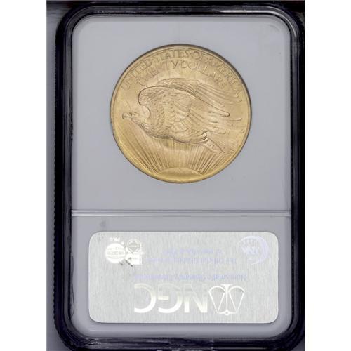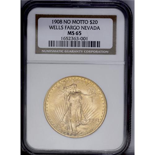 <B>1908<$20> No Motto MS65 NGC.</B></I> Ex: Wells Fargo Nevada Gold. The Wells Fargo pedigree is associated with quality, and while a "mere" Gem may not have the panache of an MS69, this coin, with its lustrous honey-gold surfaces and bold devices, would fit well in a 20th-century type set or date set.