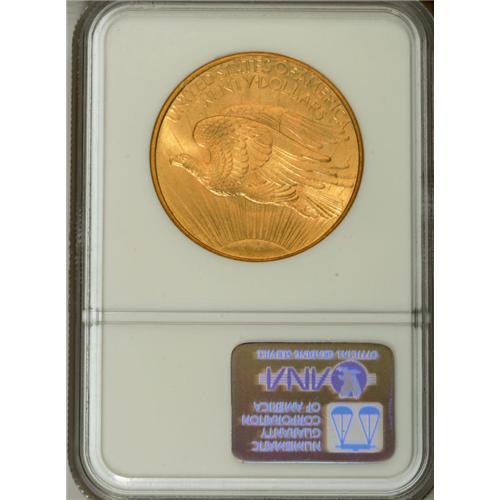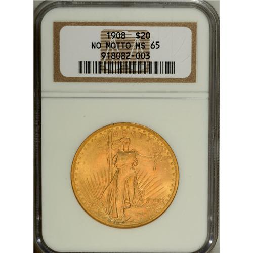 <B>1908 $20 No Motto MS65 NGC.</B></I> <BR><I>From The Twin Hollows Collection.</B></I> Consistent luster enhances the even orange-gold toning of this desirable piece. The reverse is equally as nice.<BR><BR><b>Shipping:</b> Coin/Currency (<a target="_blank" href="http://www.heritageauctions.com/common/shipping.php">view shipping information</a>)