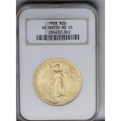 <B>1908<$20> No Motto MS65 NGC.</B></I> Long Rays subtype. An impressive Gem with lovely apricot and green-gold tints. The lustrous surfaces are unusually clean, save for a few ticks on the waist and extended arm.