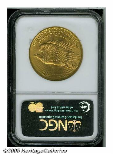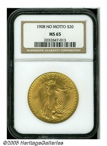 <B>1908<$20> No Motto MS65 NGC.</B></I> Well struck and fully lustrous, with smooth, clean surfaces that have a slightly grainy, matte-like texture on each side of the coin. Expectantly free of real distractions, the piece only shows a handful of minor surface marks.<BR><I>From the Dr. Kurt Peters Collection.</B></I> From the Dr. Kurt Peters Collection.