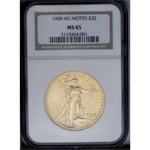 1908 $20 No Motto MS65 NGC. Well struck, save for mino
