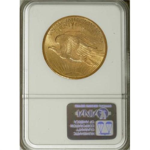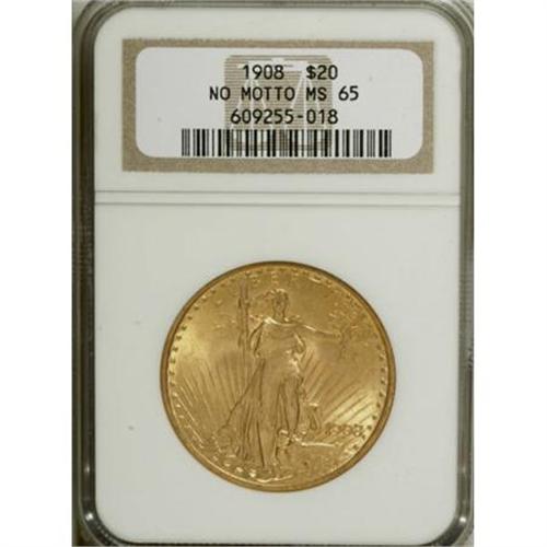 <B>1908 $20 No Motto MS65 NGC.</B></I> Long Rays Obverse. A satiny Gem with lovely olive and khaki-gold toning. Splendidly smooth, and the strike is precise save for minor blending on the eagle's leg.<BR><BR><B>Coin Engraver:</B> Augustus Saint-Gaudens<BR><BR><b>Shipping:</b> Coins & Currency (<a target="_blank" href="http://www.heritageauctions.com/common/shipping.php">view shipping information</a>\)