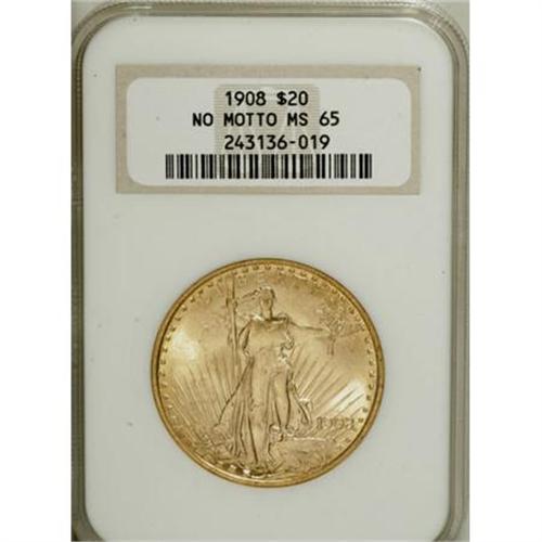 <B>1908 $20 No Motto MS65 NGC.</B></I> Both the strike and the vibrancy of the luster are decidedly finer on this Gem than on the typical 1908 No Motto twenty. Rich coloration and minimal surface marks increase the appeal. <BR><BR><B>Coin Engraver:</B> Augustus Saint-Gaudens<BR><BR><b>Shipping:</b> Coins & Currency (<a target="_blank" href="http://www.heritageauctions.com/common/shipping.php">view shipping information</a>)