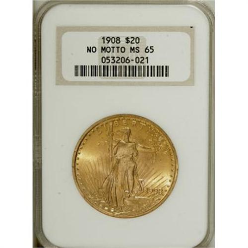 <B>1908 $20 No Motto MS65 NGC.</B></I> Long Rays obverse. Dynamic sun-gold luster sweeps this exactingly struck Gem. Well preserved aside from a thin mark concealed within the wings. Housed in an older generation holder.<BR><BR><B>Coin Engraver:</B> Augustus Saint-Gaudens<BR><BR><b>Shipping:</b> Coins & Currency (<a target="_blank" href="http://www.heritageauctions.com/common/shipping.php">view shipping information</a>)