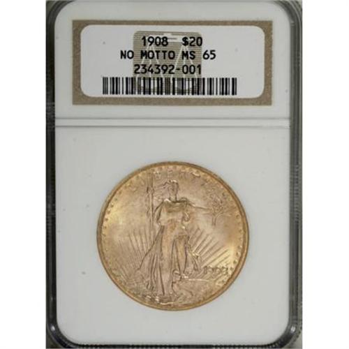 <B>1908 $20 No Motto MS65 NGC. CAC.</B></I> Pleasing luster adorns the tan-gold, minimally abraded surfaces of this No Motto Gem. A solid strike results in virtually complete definition on the design features, including clarity in the panes of the Capitol building. <BR><BR><B>Coin Engraver:</B> Augustus Saint-Gaudens<BR><BR><b>Shipping:</b> Coins & Currency (<a target="_blank" href="http://www.heritageauctions.com/common/shipping.php">view shipping information</a>)