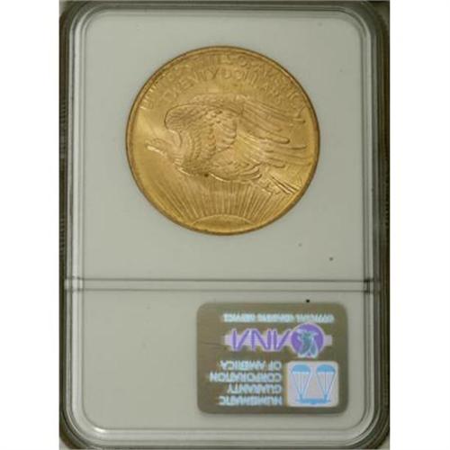 <B>1908 $20 No Motto, Wells Fargo Nevada Gold MS65 NGC.</B></I> NGC Census: (7902/4492). PCGS Population (12860/3066). Mintage: 4,271,551. Numismedia Wsl. Price for NGC/PCGS coin in MS65: $1,490. (#9142)<BR><BR><B>Coin Engraver:</B> Augustus Saint-Gaudens<BR><BR><b>Shipping:</b> Coins & Currency (<a target="_blank" href="http://www.heritageauctions.com/common/shipping.php">view shipping information</a>)