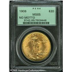 <B>1908 $20 No Motto MS65 PCGS.</B></I> A Gem example of this two-year type coin before IN GOD WE TRUST was added above the sun later in the year. Well struck with rich golden color and a minimum of marks. Lot:9468