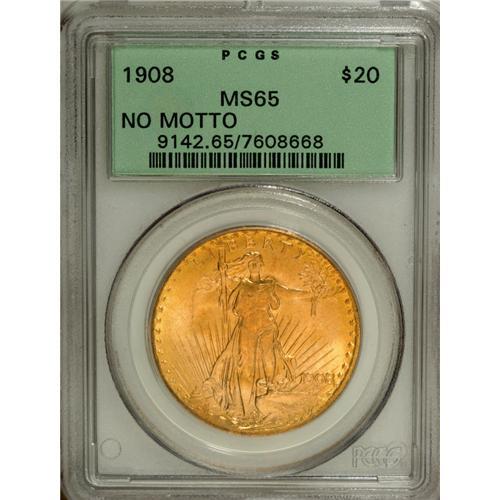 1908 $20 No Motto MS65 PCGS. Certainly one of the more