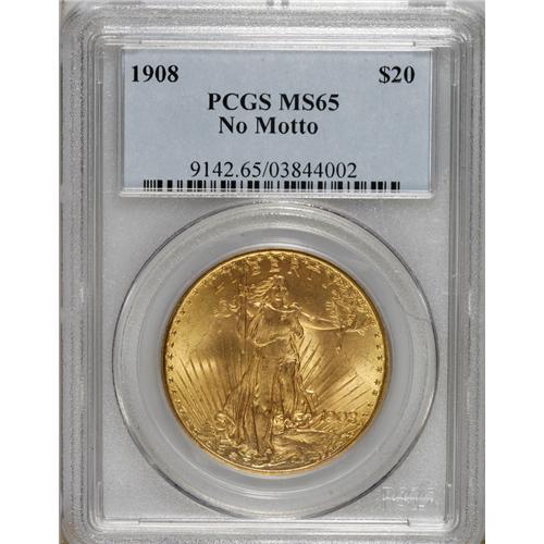 <B>1908 $20 No Motto MS65 PCGS.</B></I> Long Rays Obverse, which makes it probable that this piece did not appear in the Wells Fargo hoard. The strike is crisp except for the usual on the base of the eagle's leg.<BR><BR><b>Shipping:</b> Coins & Currency (<a target="_blank" href="http://www.heritageauctions.com/common/shipping.php">view shipping information</a>)