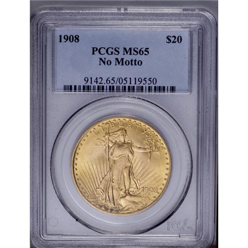 <B>1908<$20> No Motto MS65 PCGS.</B></I> Long Rays subtype. A lustrous and lovely lime-gold Gem with refreshingly clean surfaces. The strike is also above average, although the eagle's leg and Liberty's knee are incomplete, as always for the type. <BR><BR><B>Important notice:</B> Heritage usually auctions material at the rate of 200-250 lots per hour. On some occasions eBay Live bid software or the Internet may not be able to keep up with the pace of the auction. We recommend placing a realistic absentee bid now as insurance to avoid disappointment. Occasionally the auctioneer may eliminate or reject an eBay Live bid, and the auctioneer may also reopen a lot after the close of the eBay live bidding (usually because we missed an audience bid), and may reject your bid even if it shows you as the winning bidder. By bidding via eBay Live, you agree that Heritage may award the lot to another bidder at its sole discretion under the circumstances described above or any other reasonable circumstances. Since eBay bids are not shown to us until we open the lot on the floor, we treat those bids just like floor bids. In most cases the floor responds before the eBay bid is presented to us, due to Internet lag time, so for consistency we have made it a policy that floor bids are always considered first over tie eBay live bids. Also please note that all Heritage lots purchased through eBay Live carry a 20% Buyer's Premium. Please make sure you read the Terms and Conditions before you bid. This lot is being auctioned in conjunction with a live floor auction by Heritage Galleries & Auctioneers. All final auction and invoice information will be supplied by Heritage Galleries & Auctioneers, and all other information should be considered preliminary. Lot:4528 <BR><BR><B>Winning Notification and Billing:</B> After the FINAL session in this auction is complete, Heritage will send e-mail and snail mail invoices. This process normally takes several days. All final auction and invoice information will be supplied by Heritage Galleries & Auctioneers, and all other information should be considered preliminary. <BR><BR>This auction will be conducted on a live auction floor and over the Internet through eBay Live. If you choose to place an absentee bid, please take a moment to <font color='#0000ff'><u><a href='http://pages.ebay.com/liveauctions/help/before/laabsentee.html'>learn how eBay Live absentee bidding works</a></u></font><font color='#000000'>
