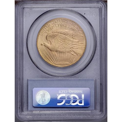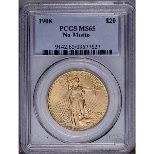 <B>1908<$20> No Motto MS65 PCGS.</B></I> Long Rays subtype. Well struck throughout the obverse, while the eagle's leg and the top of the sun show only a hint of softness. A beautifully preserved Gem. The final year of the No Motto type.