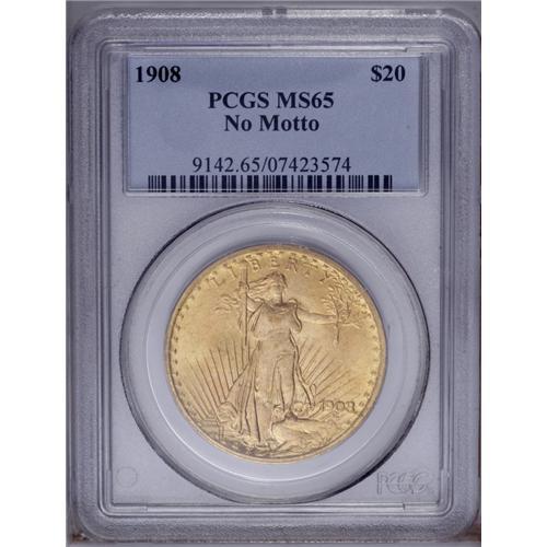 1908 $20 No Motto MS65 PCGS. Lovely peach and lime-gre 1908[$20] No Motto MS65 PCGS.