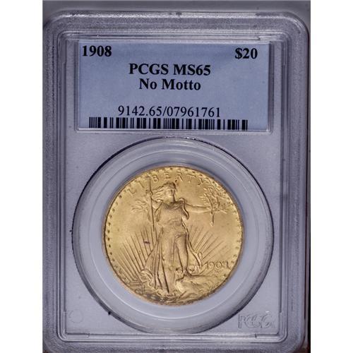 <B>1908<$20> No Motto MS65 PCGS.</B></I> Short Rays subtype. This thoroughly lustrous khaki-gold type coin has a faint alloy spot beneath the torch but is otherwise problem-free. <BR><BR><B>Important notice:</B> Heritage usually auctions material at the rate of 200-250 lots per hour. On some occasions eBay Live bid software or the Internet may not be able to keep up with the pace of the auction. We recommend placing a realistic absentee bid now as insurance to avoid disappointment. Occasionally the auctioneer may eliminate or reject an eBay Live bid, and the auctioneer may also reopen a lot after the close of the eBay live bidding (usually because we missed an audience bid), and may reject your bid even if it shows you as the winning bidder. By bidding via eBay Live, you agree that Heritage may award the lot to another bidder at its sole discretion under the circumstances described above or any other reasonable circumstances. Since eBay bids are not shown to us until we open the lot on the floor, we treat those bids just like floor bids. In most cases the floor responds before the eBay bid is presented to us, due to Internet lag time, so for consistency we have made it a policy that floor bids are always considered first over tie eBay live bids. Also please note that all Heritage lots purchased through eBay Live carry a 20% Buyer's Premium. Please make sure you read the Terms and Conditions before you bid. This lot is being auctioned in conjunction with a live floor auction by Heritage Galleries & Auctioneers. All final auction and invoice information will be supplied by Heritage Galleries & Auctioneers, and all other information should be considered preliminary. Lot:4529 <BR><BR><B>Winning Notification and Billing:</B> After the FINAL session in this auction is complete, Heritage will send e-mail and snail mail invoices. This process normally takes several days. All final auction and invoice information will be supplied by Heritage Galleries & Auctioneers, and all other information should be considered preliminary. <BR><BR>This auction will be conducted on a live auction floor and over the Internet through eBay Live. If you choose to place an absentee bid, please take a moment to <font color='#0000ff'><u><a href='http://pages.ebay.com/liveauctions/help/before/laabsentee.html'>learn how eBay Live absentee bidding works</a></u></font><font color='#000000'>