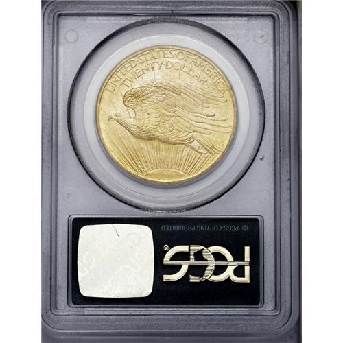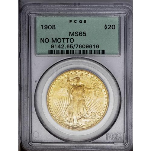 <B>1908<$20> No Motto MS65 PCGS.</B></I> Short rays subtype. This older holder Gem is lustrous and attractively toned in dusky apricot hues. A few inconsequential marks do not require elaboration. <BR><BR><B>Important notice:</B> Heritage usually auctions material at the rate of 200-250 lots per hour. On some occasions eBay Live bid software or the Internet may not be able to keep up with the pace of the auction. We recommend placing a realistic absentee bid now as insurance to avoid disappointment. Occasionally the auctioneer may eliminate or reject an eBay Live bid, and the auctioneer may also reopen a lot after the close of the eBay live bidding (usually because we missed an audience bid), and may reject your bid even if it shows you as the winning bidder. By bidding via eBay Live, you agree that Heritage may award the lot to another bidder at its sole discretion under the circumstances described above or any other reasonable circumstances. Since eBay bids are not shown to us until we open the lot on the floor, we treat those bids just like floor bids. In most cases the floor responds before the eBay bid is presented to us, due to Internet lag time, so for consistency we have made it a policy that floor bids are always considered first over tie eBay live bids. Also please note that all Heritage lots purchased through eBay Live carry a 20% Buyer's Premium. Please make sure you read the Terms and Conditions before you bid. This lot is being auctioned in conjunction with a live floor auction by Heritage Galleries & Auctioneers. All final auction and invoice information will be supplied by Heritage Galleries & Auctioneers, and all other information should be considered preliminary. Lot:4543 <BR><BR><B>Winning Notification and Billing:</B> After the FINAL session in this auction is complete, Heritage will send e-mail and snail mail invoices. This process normally takes several days. All final auction and invoice information will be supplied by Heritage Galleries & Auctioneers, and all other information should be considered preliminary. <BR><BR>This auction will be conducted on a live auction floor and over the Internet through eBay Live. If you choose to place an absentee bid, please take a moment to <font color='#0000ff'><u><a href='http://pages.ebay.com/liveauctions/help/before/laabsentee.html'>learn how eBay Live absentee bidding works</a></u></font><font color='#000000'>