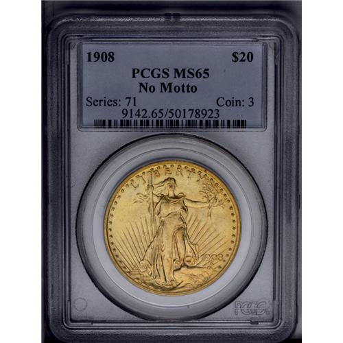 <B>1908<$20> No Motto MS65 PCGS.</B></I> The sharply struck devices are lemon-yellow, while the fields are tinted with lime green and rose. This piece is a true Gem, lustrous and attractive with minimal marks.<BR><I>From The Stephen Stokely Collection.</B></I>