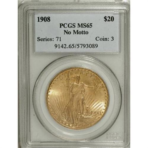 <B>1908 $20 No Motto MS65 PCGS.</B></I> Lustrous and well preserved, with lovely honey-gold coloration and boldly struck design elements. Only trivial marks are found on either side. The No Motto type was only produced for two years, ensuring its popularity among collectors of the Saint-Gaudens double eagle series. <BR><BR><b>Shipping:</b> Coins & Currency (<a target="_blank" href="http://www.heritageauctions.com/common/shipping.php">view shipping information</a>)