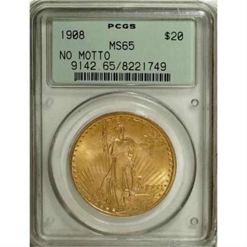<B>1908 $20 No Motto MS65 PCGS.</B></I> PCGS Population (12069/2907). NGC Census: (7719/4332). Mintage: 4,271,551. Numismedia Wsl. Price for NGC/PCGS coin in MS65: $1,240. (#9142)<BR><BR><B>Coin Engraver:</B> Augustus Saint-Gaudens<BR><BR><b>Shipping:</b> Coins & Currency (<a target="_blank" href="http://www.heritageauctions.com/common/shipping.php">view shipping information</a>)
