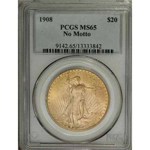 <B>1908 $20 No Motto MS65 PCGS.</B></I> PCGS Population (12093/2909). NGC Census: (7719/4332). Mintage: 4,271,551. Numismedia Wsl. Price for NGC/PCGS coin in MS65: $1,240. (#9142)<BR><BR><B>Coin Engraver:</B> Augustus Saint-Gaudens<BR><BR><b>Shipping:</b> Coins & Currency (<a target="_blank" href="http://www.heritageauctions.com/common/shipping.php">view shipping information</a>)